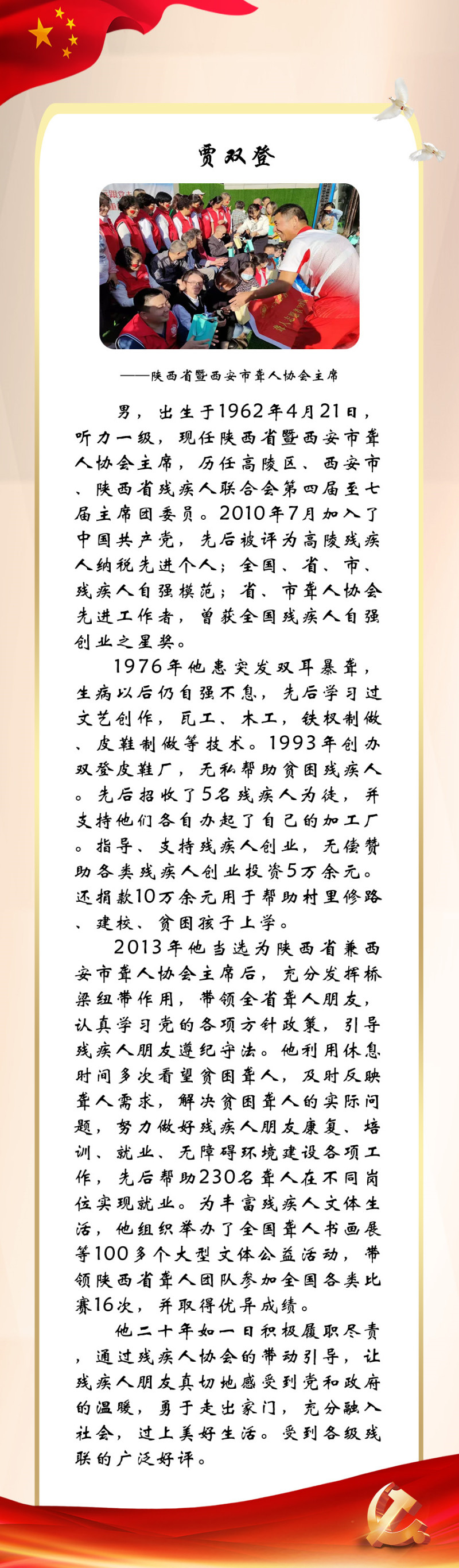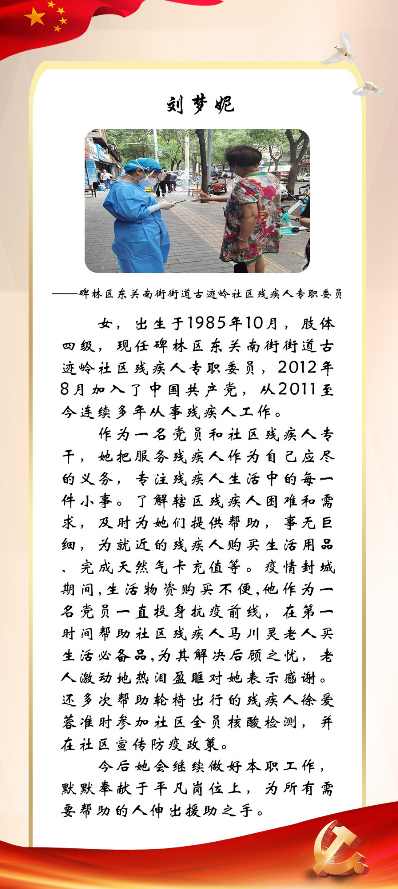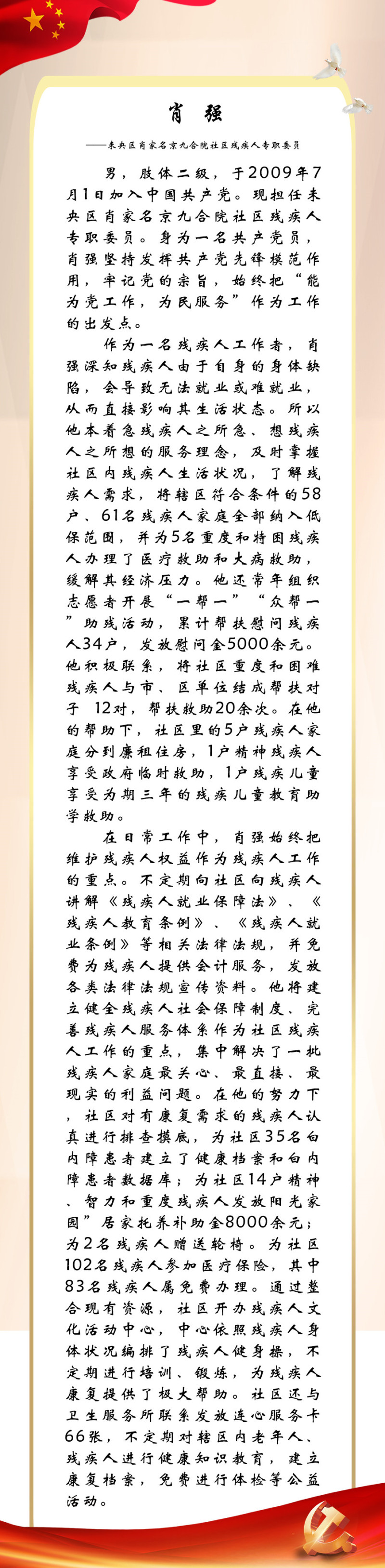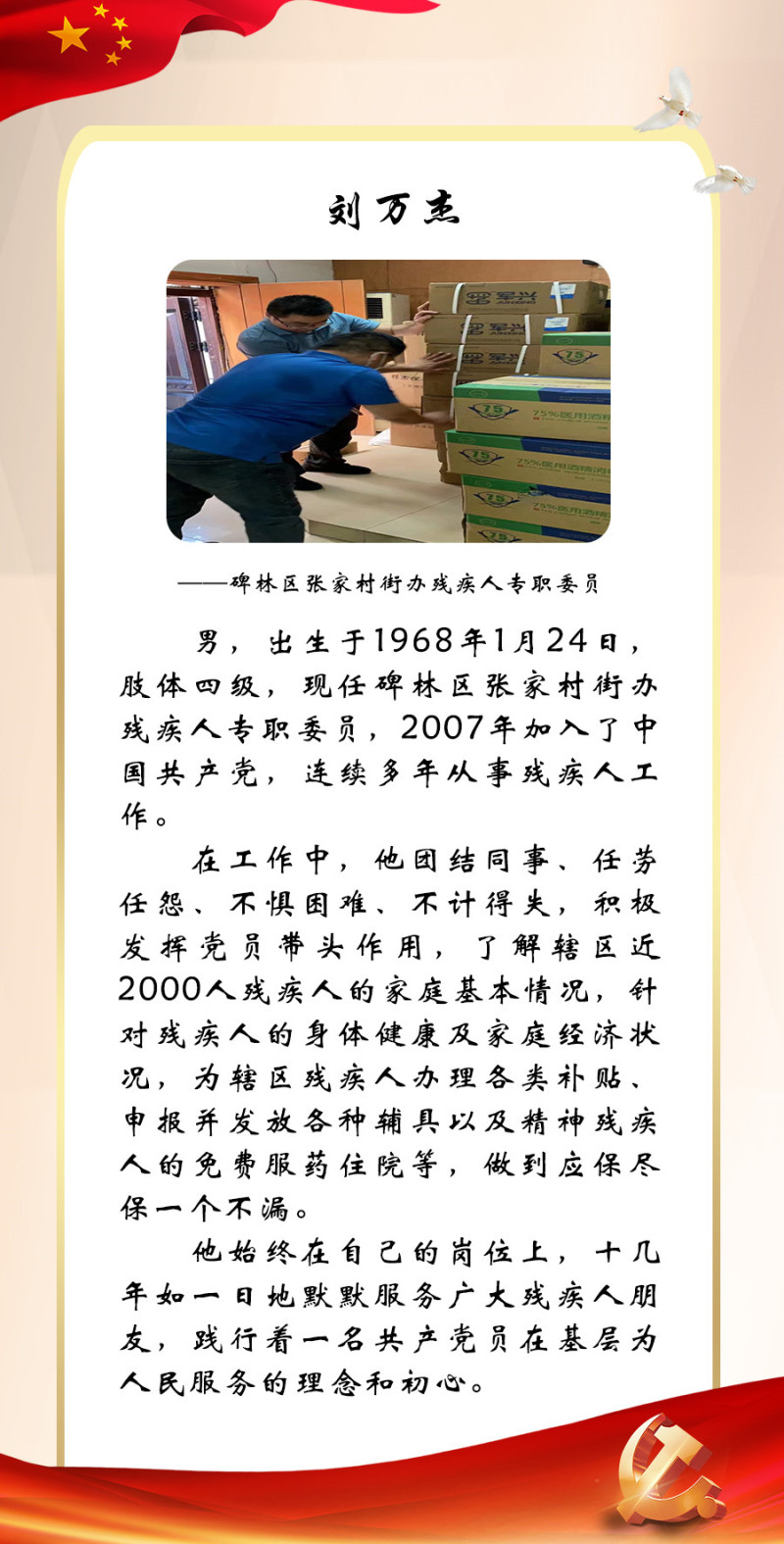 今年是党的二十大召开之年,也是残疾人就业宣传年。为迎接中国共产党第二十次全国代表大会的胜利召开,西安市残联开展了“喜迎二十大 永远跟党走”百名党员为残疾人送温暖活动,为我市100名已就业创业的残疾人共产党员所联系结对帮扶的残疾人朋友捐赠陕西广电电视套餐年卡。同时,我们对部分残疾人共产党员的简要事迹进行展播,以此来迎接二十大的胜利召开!
