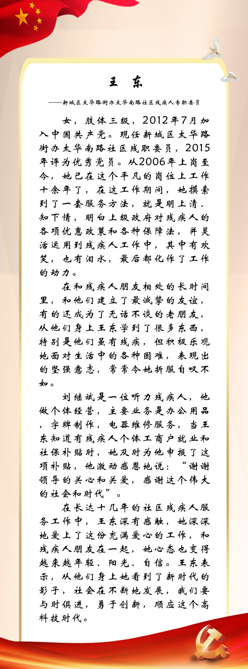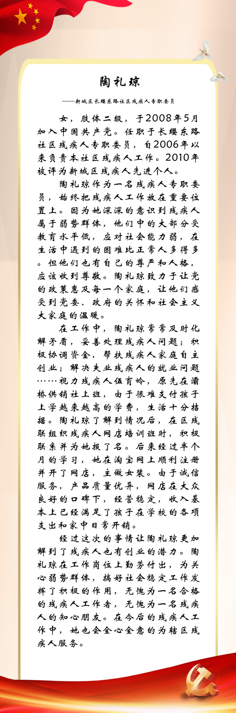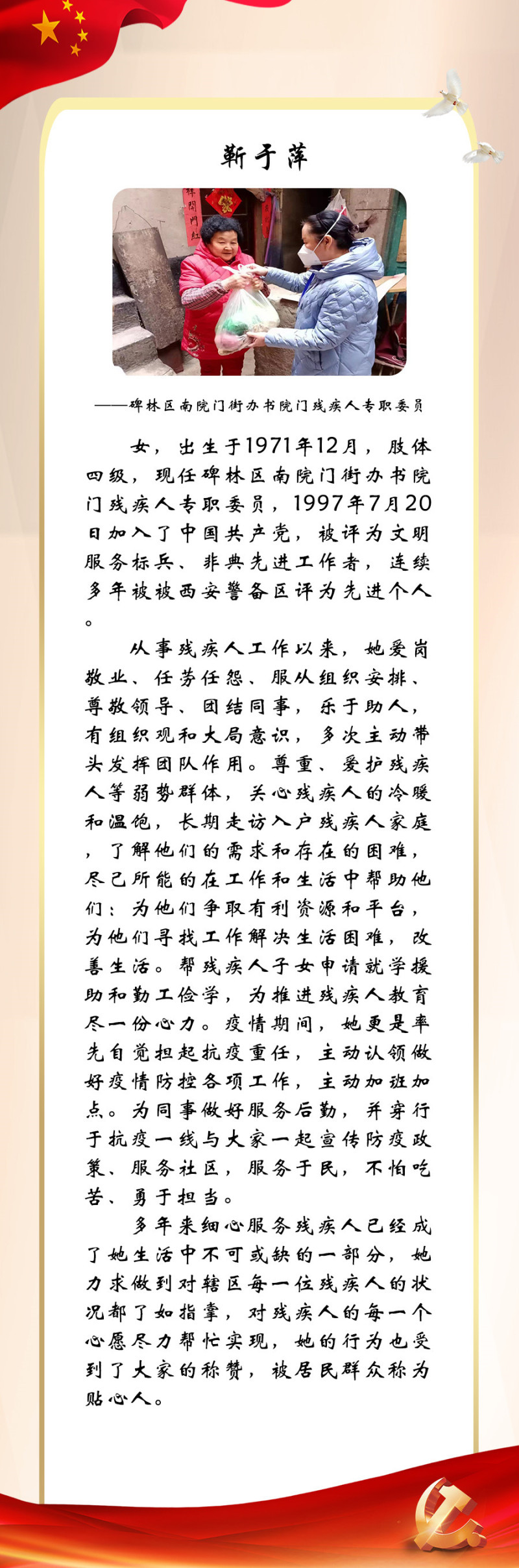 今年是党的二十大召开之年,也是残疾人就业宣传年。为迎接中国共产党第二十次全国代表大会的胜利召开,西安市残联开展了“喜迎二十大 永远跟党走”百名党员为残疾人送温暖活动,为我市100名已就业创业的残疾人共产党员所联系结对帮扶的残疾人朋友捐赠陕西广电电视套餐年卡。同时,我们对部分残疾人共产党员的简要事迹进行展播,以此来迎接二十大的胜利召开!