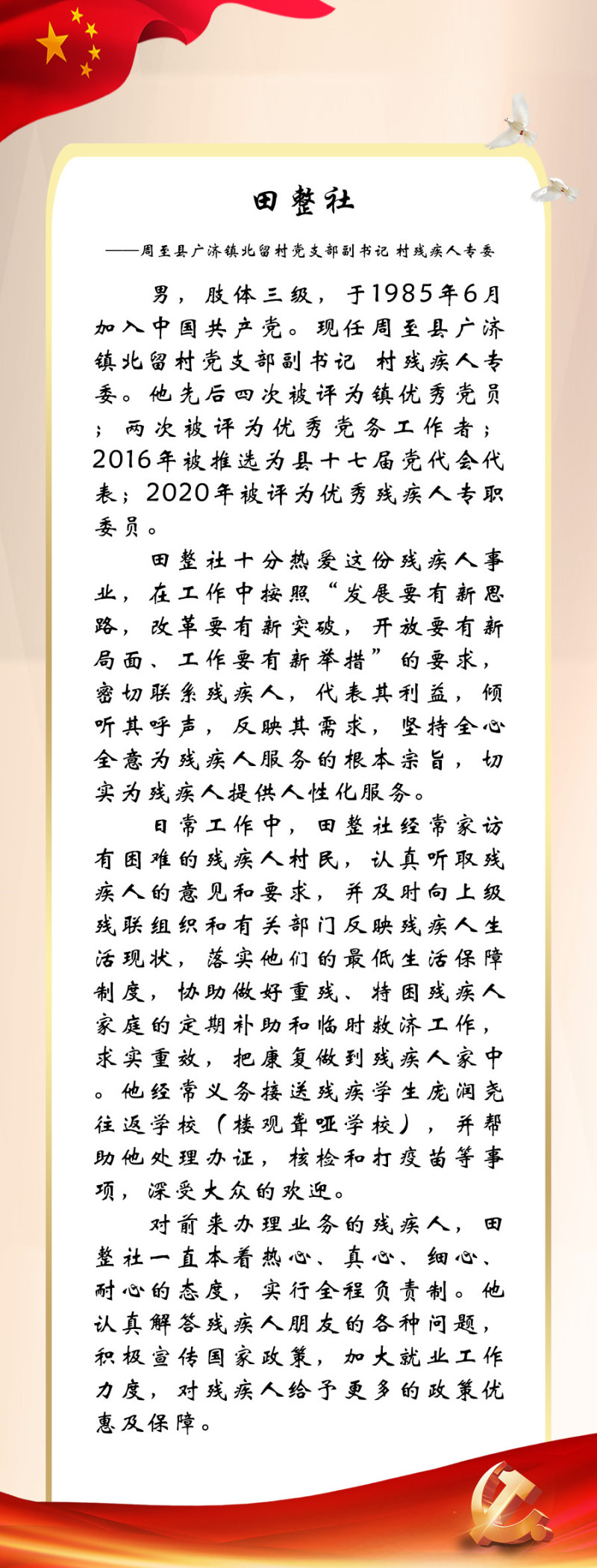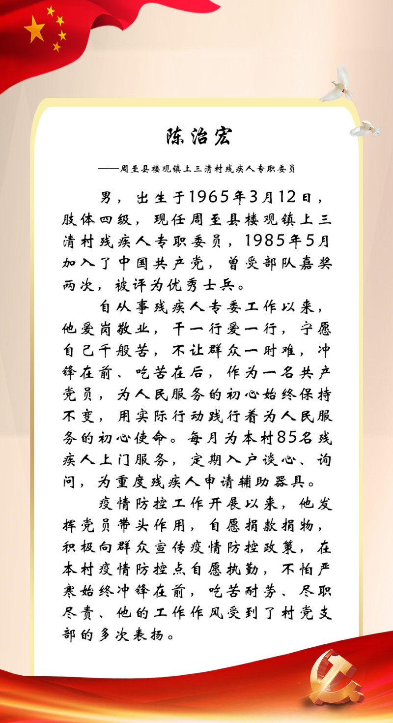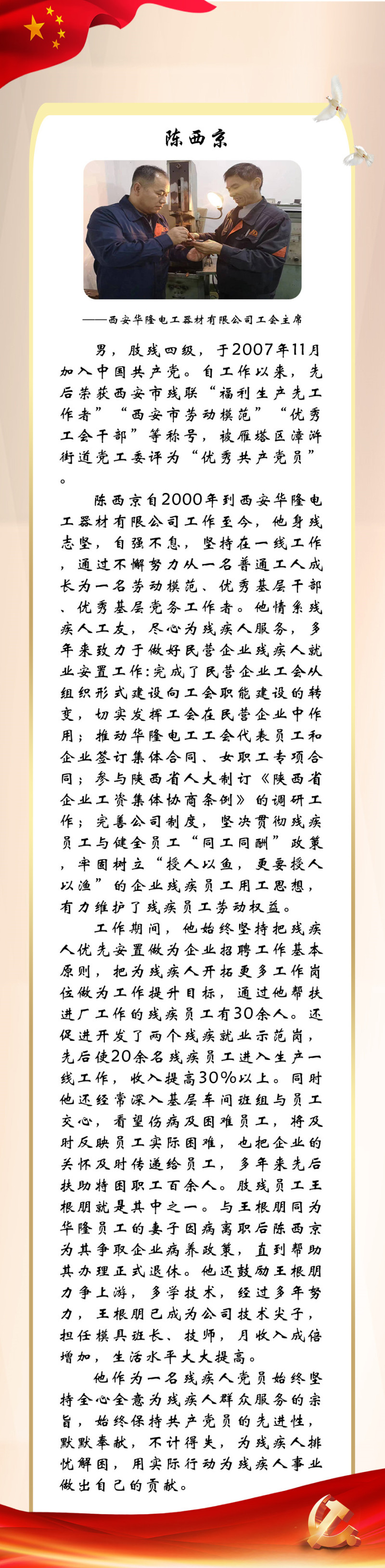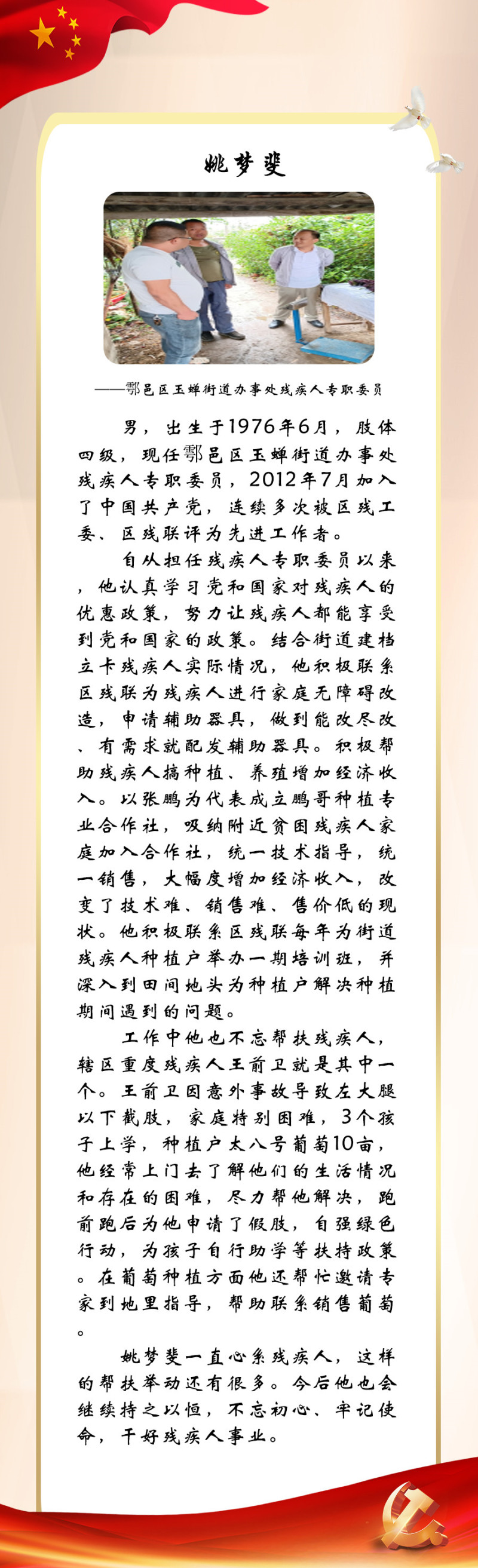今年是党的二十大召开之年,也是残疾人就业宣传年。为迎接中国共产党第二十次全国代表大会的胜利召开,西安市残联开展了“喜迎二十大 永远跟党走”百名党员为残疾人送温暖活动,为我市100名已就业创业的残疾人共产党员所联系结对帮扶的残疾人朋友捐赠陕西广电电视套餐年卡。同时,我们对部分残疾人共产党员的简要事迹进行展播,以此来迎接二十大的胜利召开!
