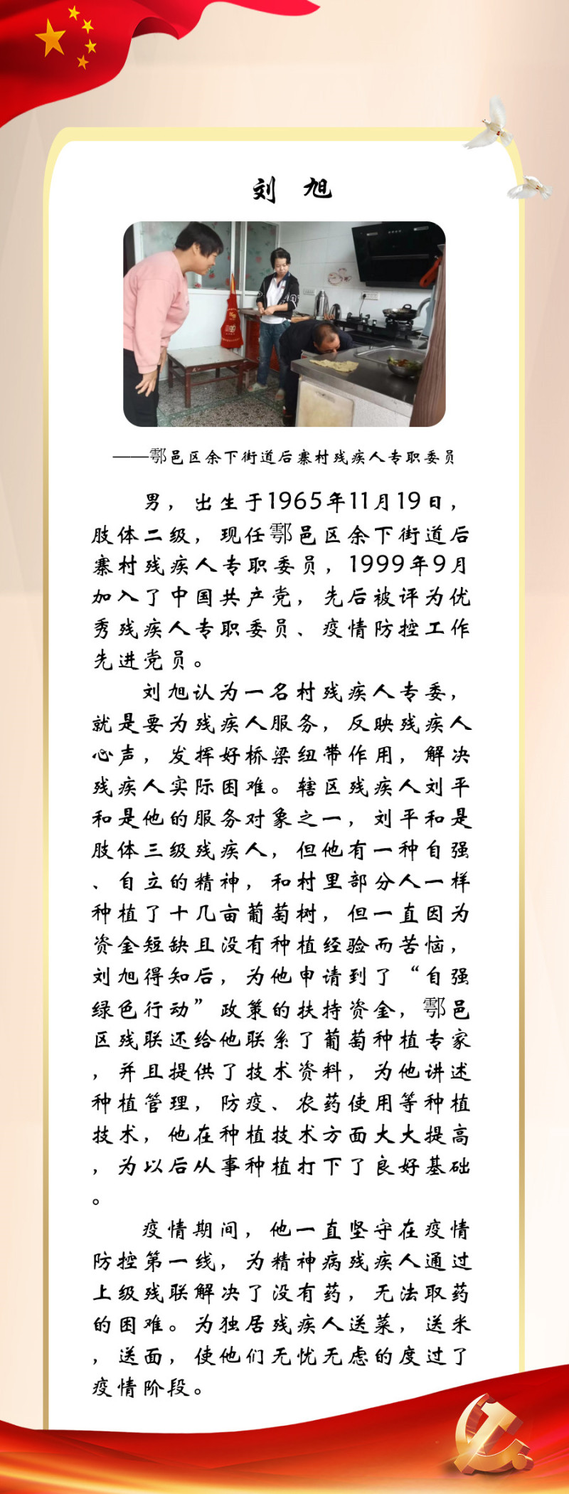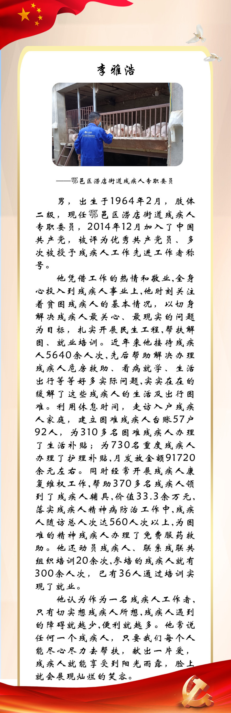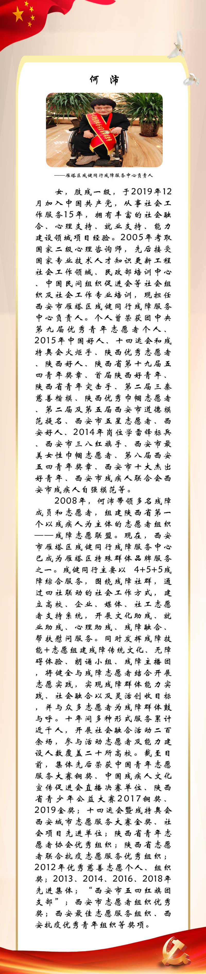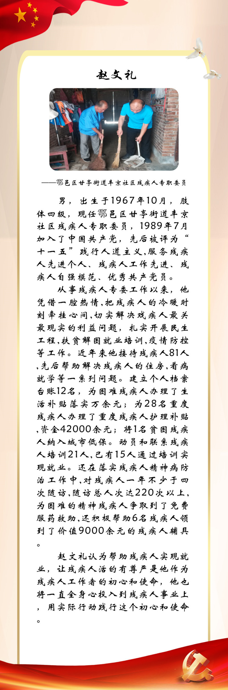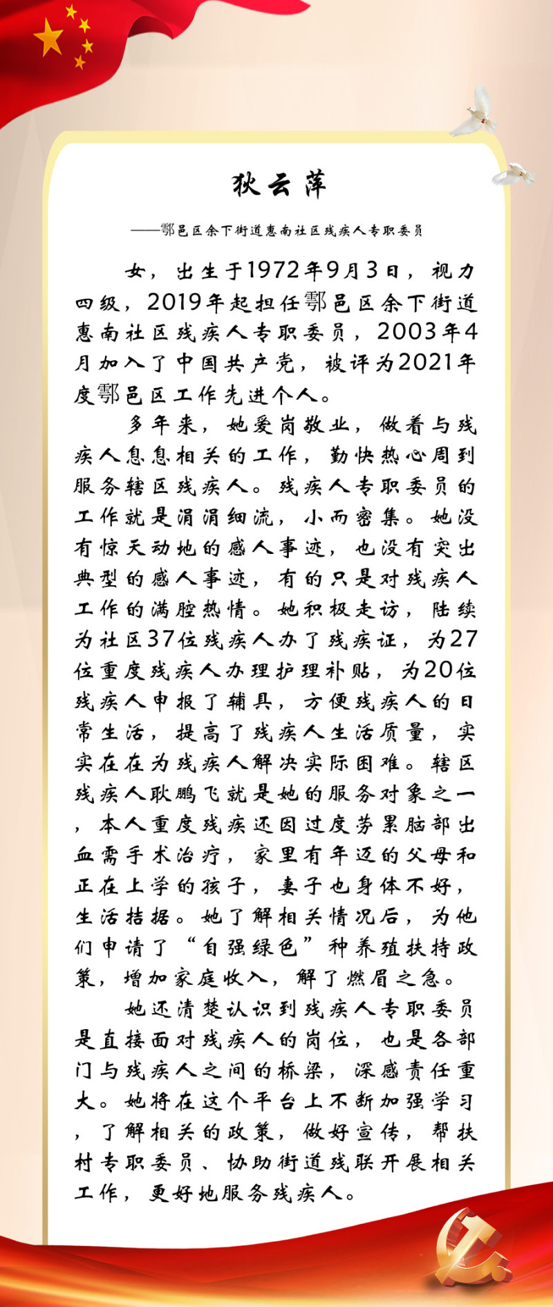 今年是党的二十大召开之年,也是残疾人就业宣传年。为迎接中国共产党第二十次全国代表大会的胜利召开,西安市残联开展了“喜迎二十大 永远跟党走”百名党员为残疾人送温暖活动,为我市100名已就业创业的残疾人共产党员所联系结对帮扶的残疾人朋友捐赠陕西广电电视套餐年卡。同时,我们对部分残疾人共产党员的简要事迹进行展播,以此来迎接二十大的胜利召开!