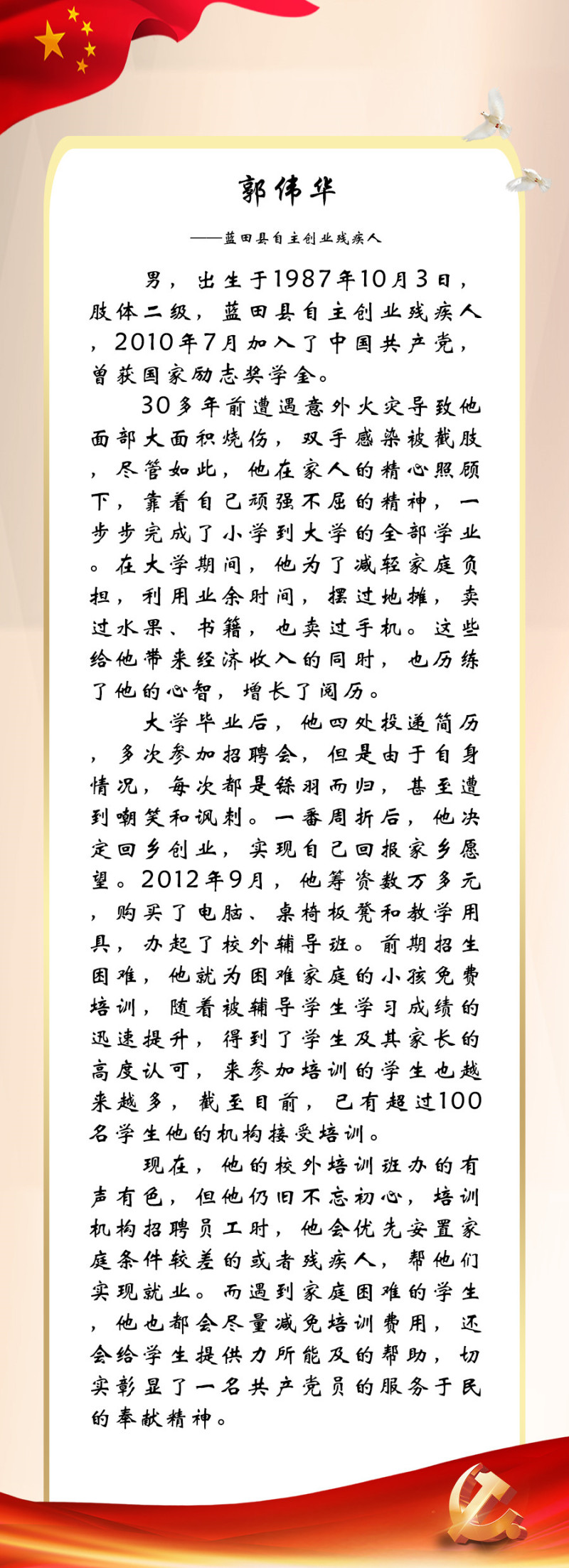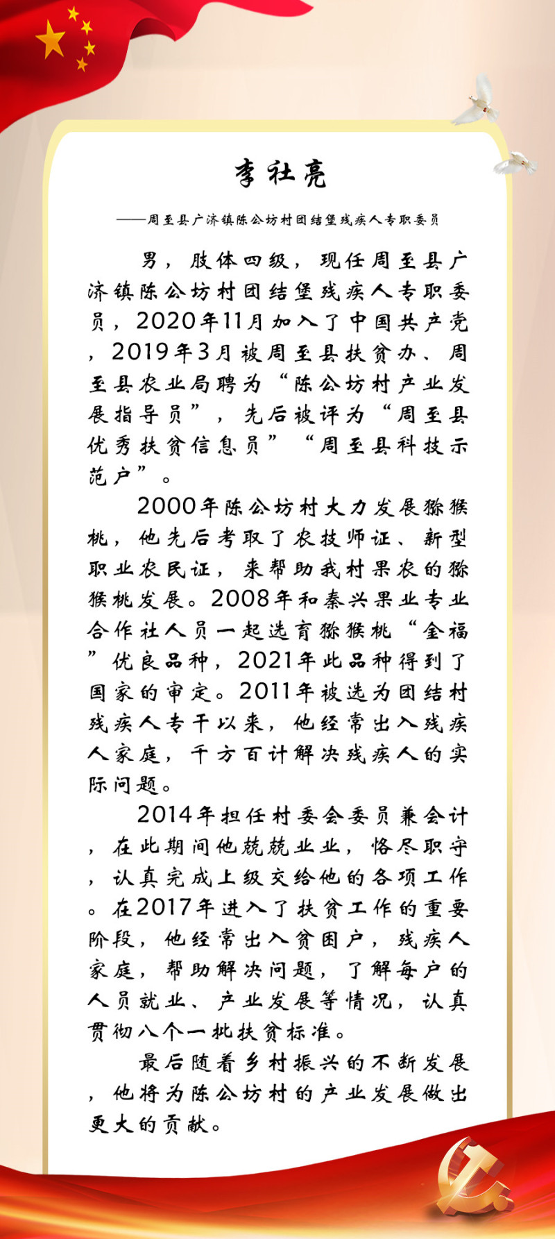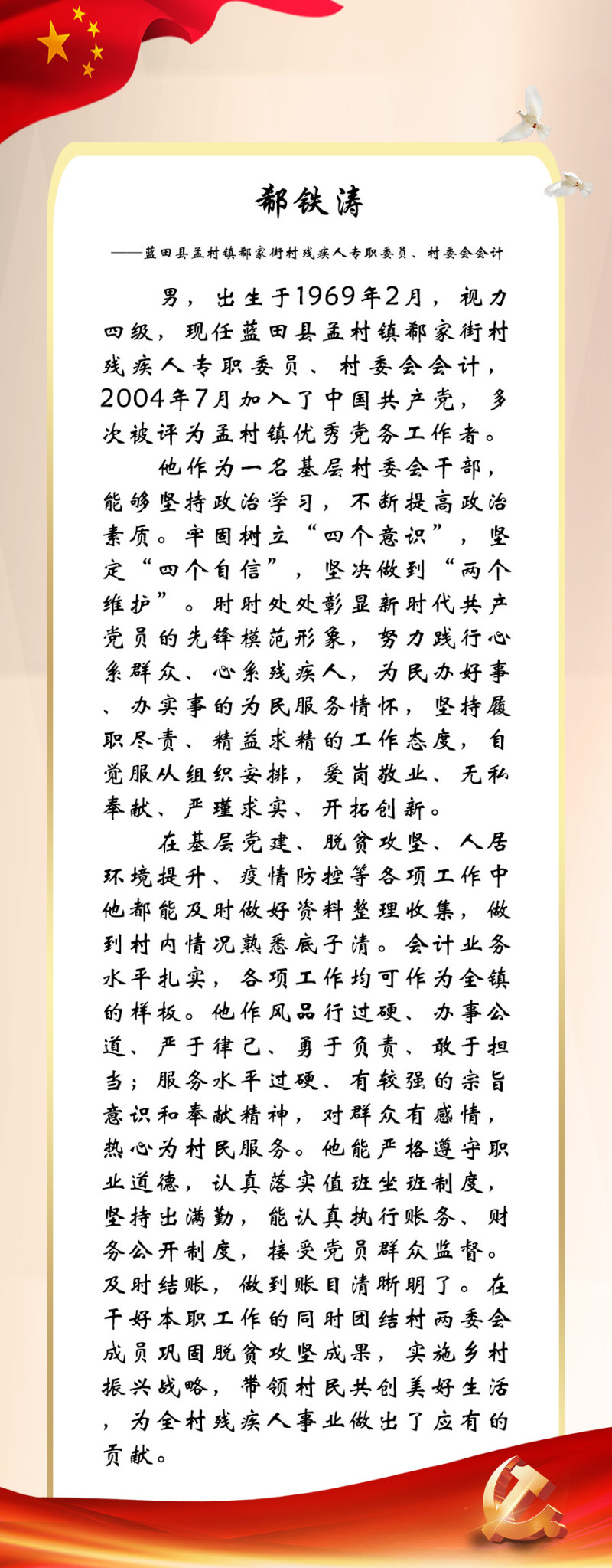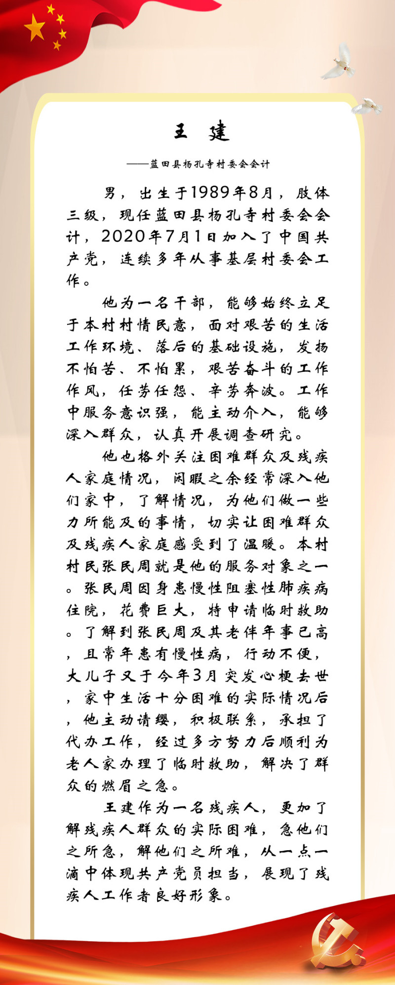 今年是党的二十大召开之年,也是残疾人就业宣传年。为迎接中国共产党第二十次全国代表大会的胜利召开,西安市残联开展了“喜迎二十大 永远跟党走”百名党员为残疾人送温暖活动,为我市100名已就业创业的残疾人共产党员所联系结对帮扶的残疾人朋友捐赠陕西广电电视套餐年卡。同时,我们对部分残疾人共产党员的简要事迹进行展播,以此来迎接二十大的胜利召开!