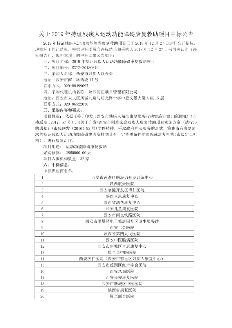 关于2019年持证残疾人运动功能障碍康复项目中标公告