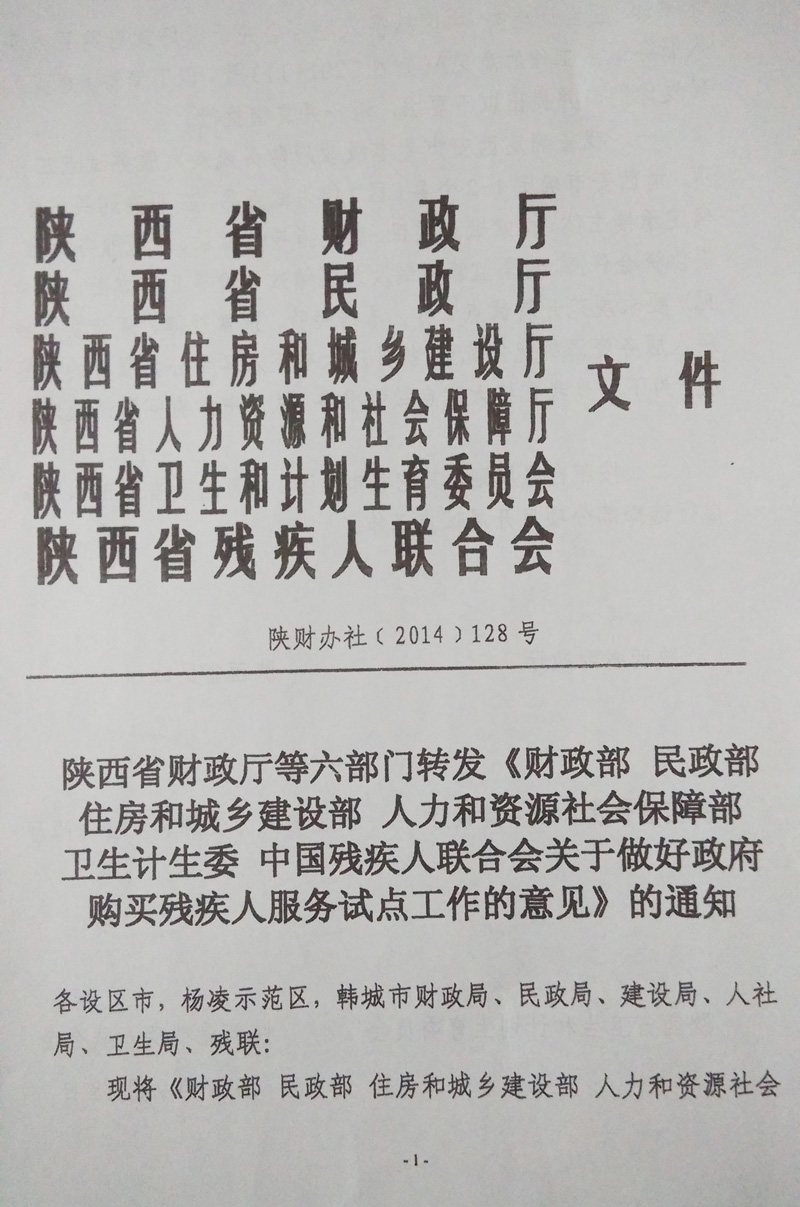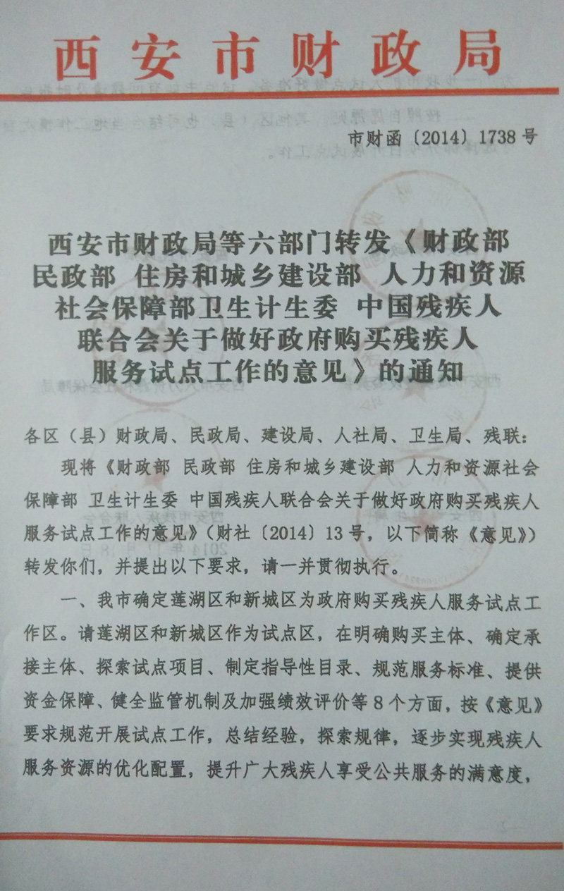 为深入贯彻党的十八大和十八届三中全会精神,有效落实《国务院办公厅关于政府向社会力量购买服务的指导意见》(国办发〔2013〕96号),积极推动政府购买残疾人服务工作的有序发展,现就做好政府购买残疾人服务试点工作通知如下: