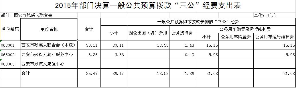 2015年西安市残疾人联合会“三公”经费支出合计36.47 万元,其中因公出国(境)费用13.53万元;公务接待费用1.86万元;公务用车购置及运行维护费21.08万元。