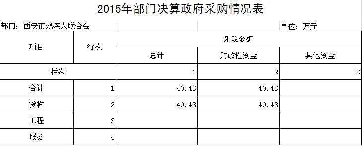 2015年西安市残疾人联合会政府采购合计支出40.43万元,主要用于购置办公设备等货物类支出,履行政府采购相关规定及要求。