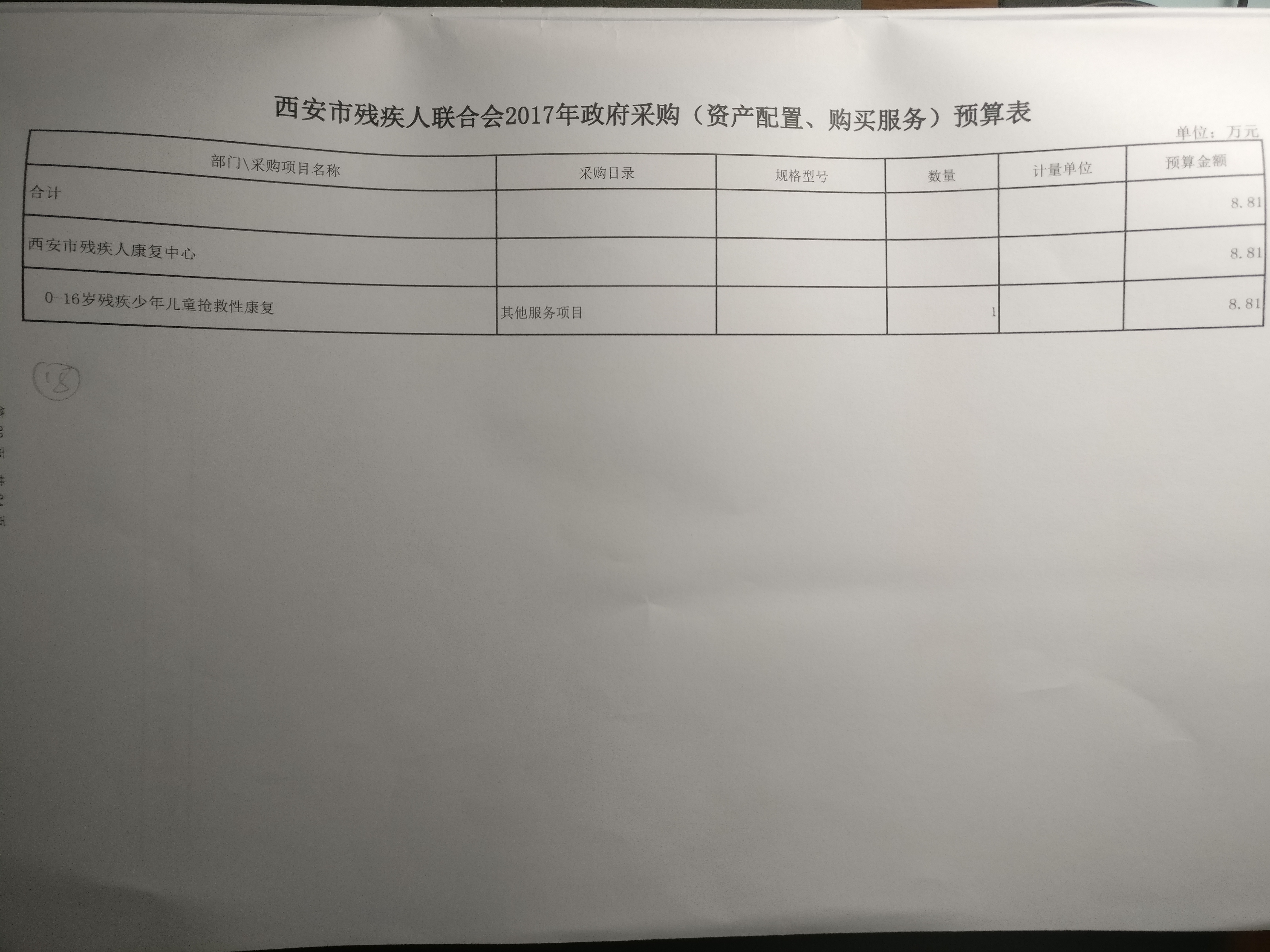 三.2017年残疾人联合会安排政府采购8.81万元。此项目实施单位为西安市残疾人康复中心,项目名称0-16岁残疾少年儿童抢救性康复助听器招标尾款。