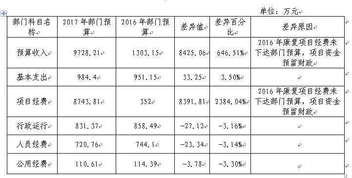 一.2017年部门预算收入9728.21万元。其中:基本支出984.4万元,项目经费8743.81万元。2016年部门预算收入1303.15万元。其中:基本支出951.15万元,项目经费352万元。2017年部门预算收入增加比例646.51%。增加原因:2016年部门预算收入中项目经费预留财政局账户,未下达至部门预算中,故增加比例过大。