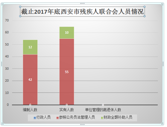 截止2017年底,西安市残疾人联合会人员编制54人,其中行政编制0人,事业编制54人(参照公务员法管理人员42人,财政全额补助人员12人);实有人员65人,其中行政编制0人,事业编制65人(参照公务员法管理人员55人,财政全额补助人员10人)。单位管理的离退休人员0人。
