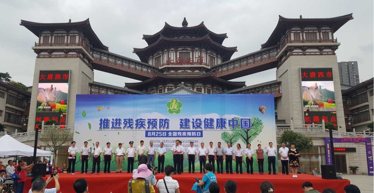 2017年8月25日是第一次全国“残疾预防日”,25日上午在大唐西市举行了主题为“推进残疾预防 建设健康中国”的活动启动仪式。此次活动由省政府残工委主办,市政府残工委和莲湖区残工委承办,省、市、区级相关部门医疗机构参加了活动。活动中,莲湖区代表“全国残疾预防综合试验区重点干预项目”试点区县发言,西安市领导致辞,省卫计委代表省级部分发言,省政府残工委副主任朱峰讲话,相关部门领导为定点医疗机构授牌,活动由省残工委副主任薛建兴主持。