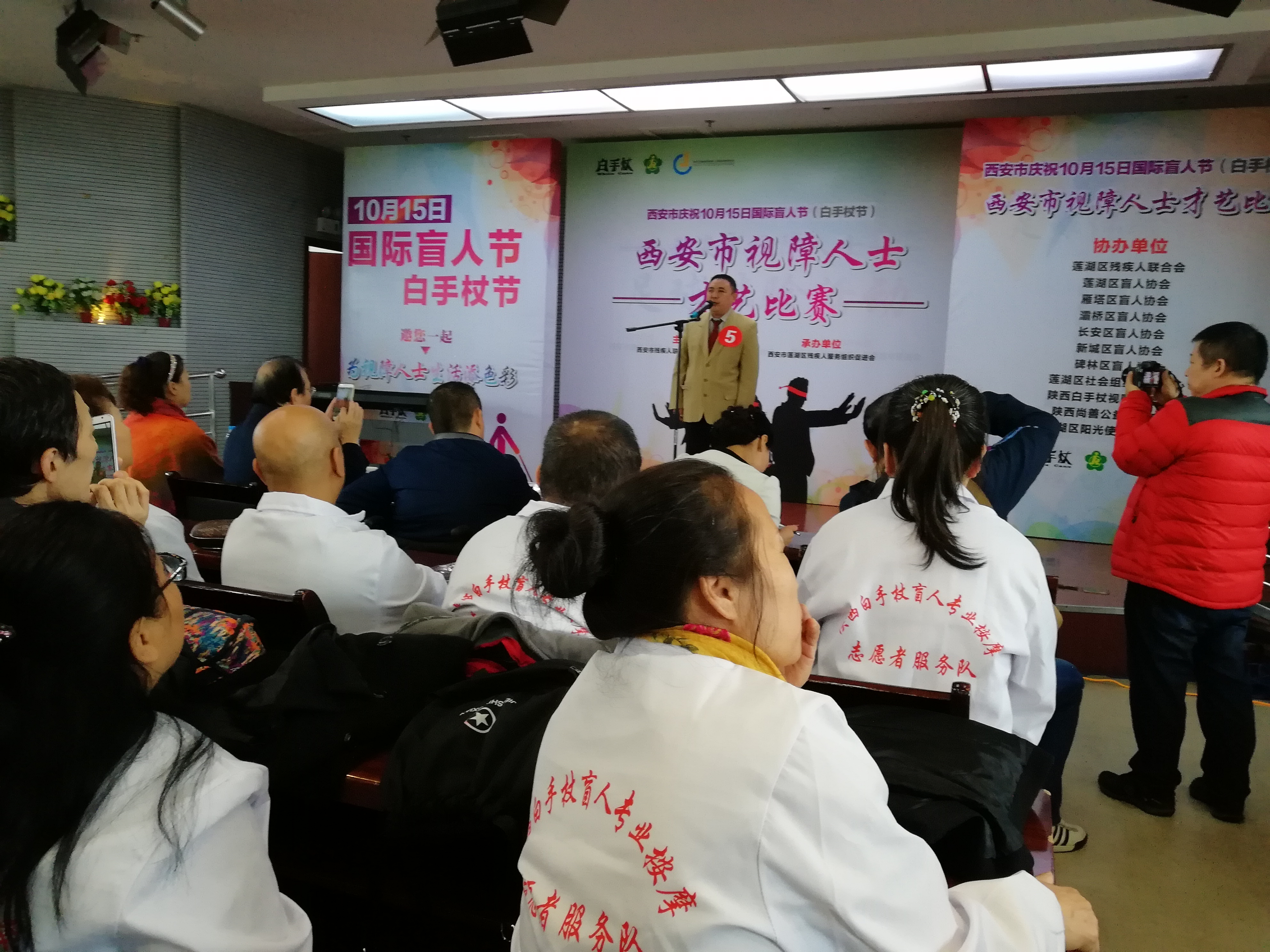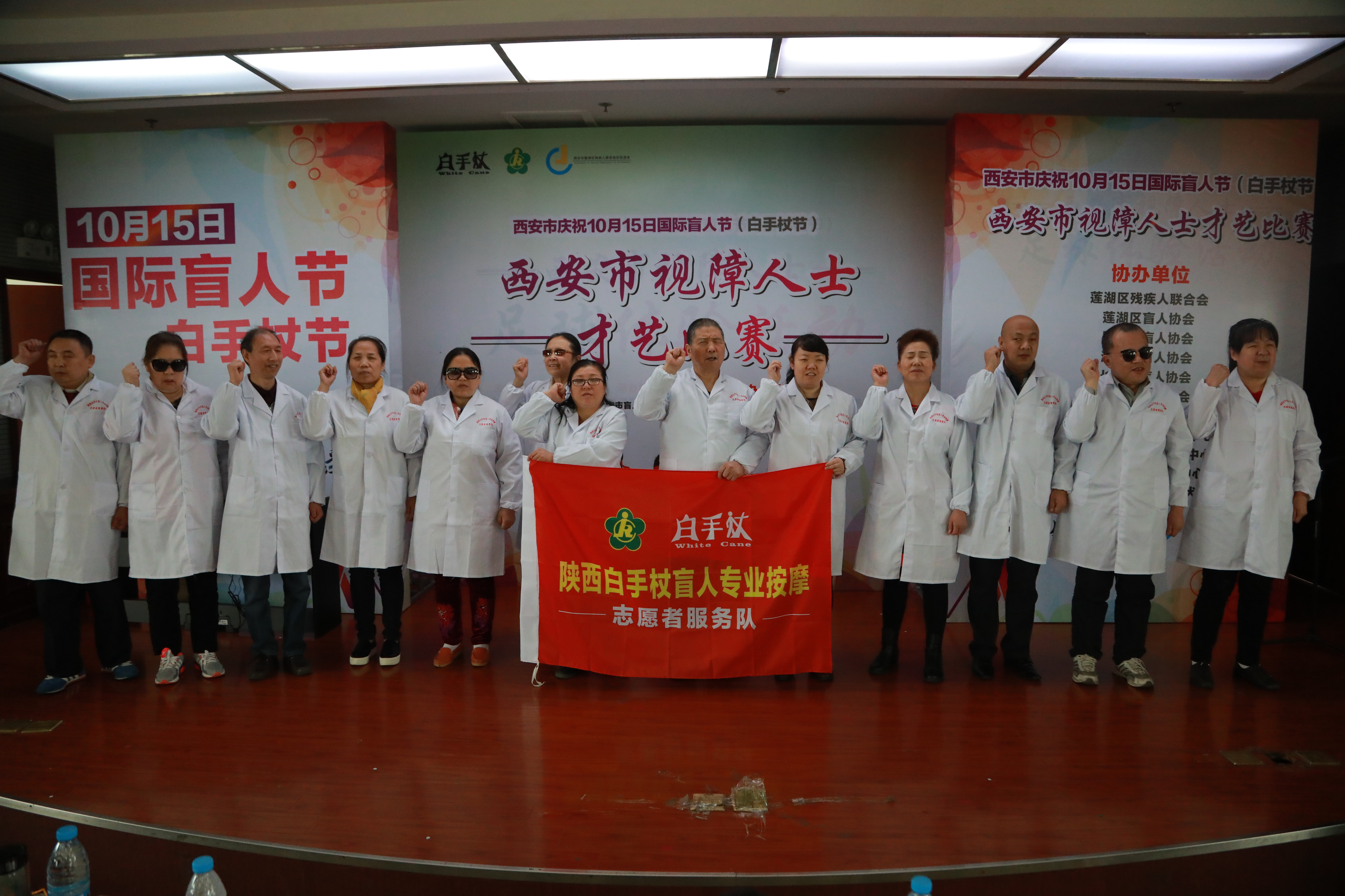 10月15日,西安市聋人协会在莲湖区残联10楼会议室举办了盲人才艺比赛和盲人足球体验活动,庆祝第34个“国际盲人节”。全市8个区县派出36名盲人参加了声乐类、乐器类、语言类比赛,170多名盲人及志愿者观众参与了活动。活动当天, 还成立了由16位专业盲人按摩师组成的陕西白手杖盲人专业按摩志愿者服务队,市盲人协会主席魏国光任队长, 服务队将走进社区、企业单位,为群众健康进行义务专业按摩志愿服务。