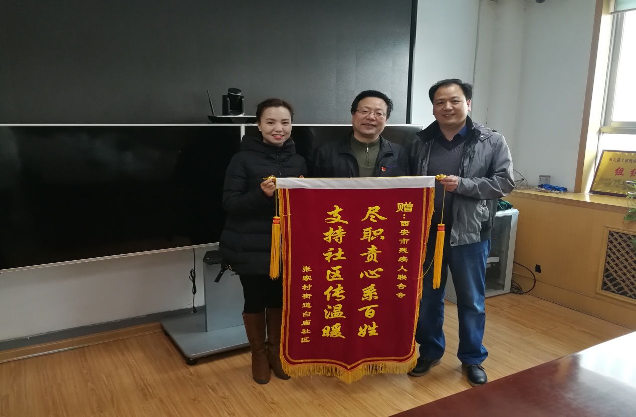 2月19日上午,张家村街道白庙社区党务干部薄少飞代表社区党委向我会赠送了锦旗,并与分管领导副理事长何永国进行了座谈,总结了2017年度社区工作开展情况。副理事长何永国表示今后市残联将一如既往支持好社区工作,抓好党员干部进社区志愿服务活动,努力当好社区“五星级服务员”。