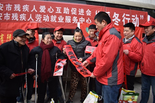 为了使特困残疾人度过一个幸福祥和的春节,由西安市残疾人爱心互助促进会、西安市残疾人劳动就业服务中心动员社会爱心人士捐款组织开展的慰问残疾人“暖冬行动”助残活动,在2月1日揭开帷幕。我市各区县的400位残疾人将收到价值约200元的米、面、油、春联等春节慰问品。主办方希望以此活动让残疾人朋友感受到来自社会的关爱。