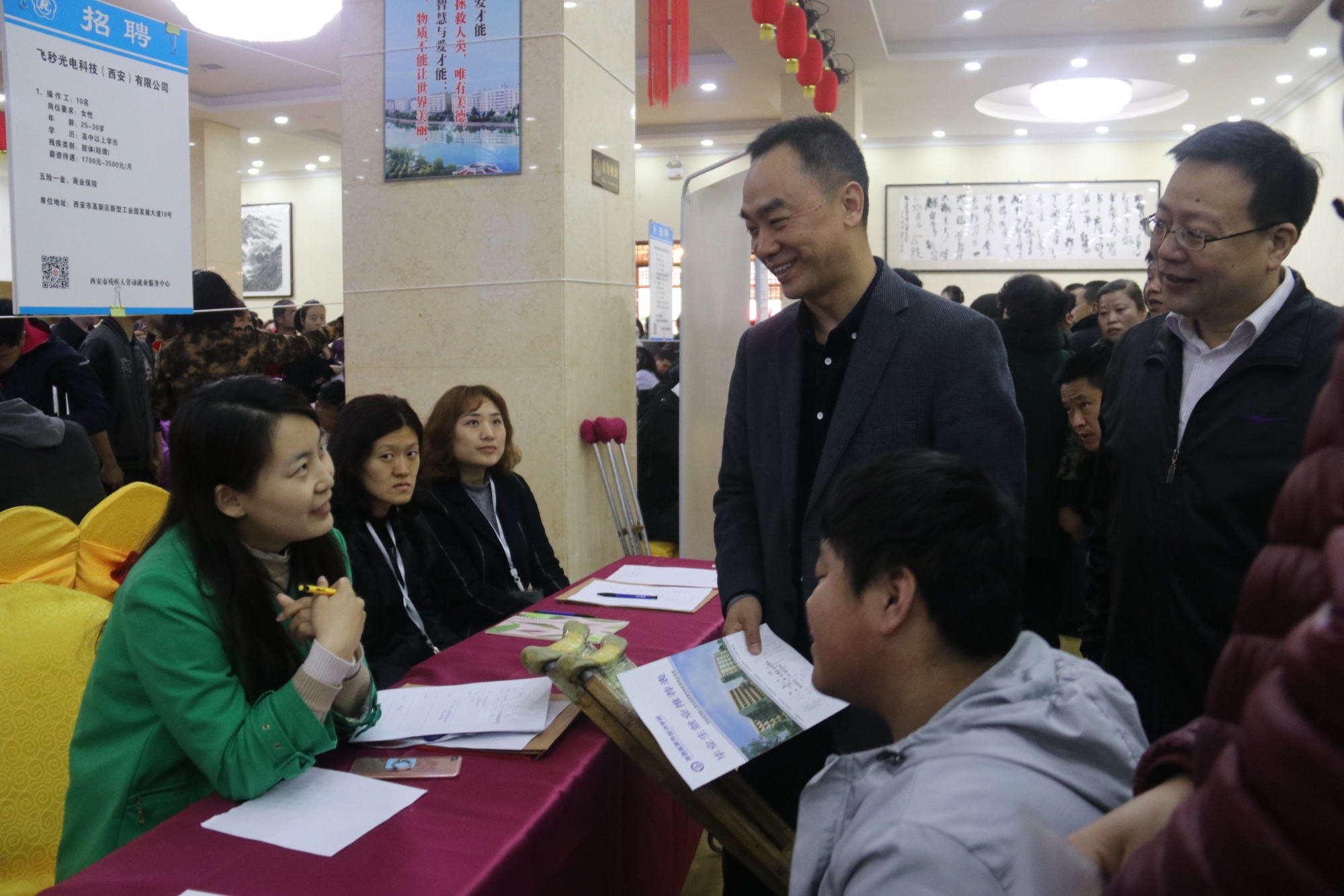 招聘会还受到了西安市残联党组、理事会的高度重视。市残联党组书记、理事长李忠良、副理事长何永国专程来到会场与用人单位单位和参会应聘的高校残疾毕业生进行了亲切的交谈。