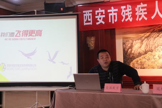 在创业经验交流环节,来自雁塔区的西安鸿鹰影视文化传媒有限公司王磊、周至县的天然农夫果园董晓民、长安区的益康盲人按摩中心王宁以及西安市丽莎贝尔花艺职业培训学校姚利军等涵盖了高科技动漫制作、电商创业、盲人按摩、教育培训等不同领域的四位创业代表,先后同与会者分享了各自的创业历程和创业经验。与此同时,就业中心的相关负责同志还对我市的残疾人创业扶持政策以及相关配套扶持政策进行了介绍。