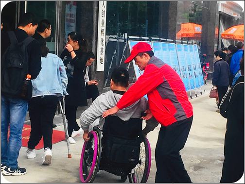 来自西安市残疾人爱心互助促进会的助残志愿者为招聘会提供志愿服务,未央区高晨昱中西医结合诊所的残疾人创业医生高晨昱为活动提供医疗服务。