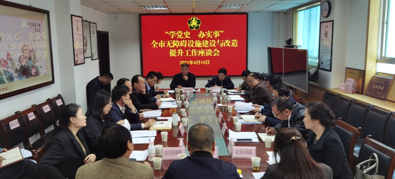 2021年4月14日上午,市残联召开“学党史 办实事”全市无障碍设施建设与改造提升工作座谈会,深入贯彻中央关于开展“我为群众办实事”实践活动的部署要求,坚持把学习党史同推动工作紧密结合起来,弘扬党的光荣传统、优良作风,践行党的初心使命、根本宗旨,用心用情用力推动全市无障碍设施建设与改造提升工作不断往实里做,以一流标准和服务水平,迎接第十一届残运会暨第八届特奥会顺利召开。会议由市残联党组书记赵寅科主持,市残联班子成员,16个区县残联和开发区残疾人工作主要负责人参加会议。