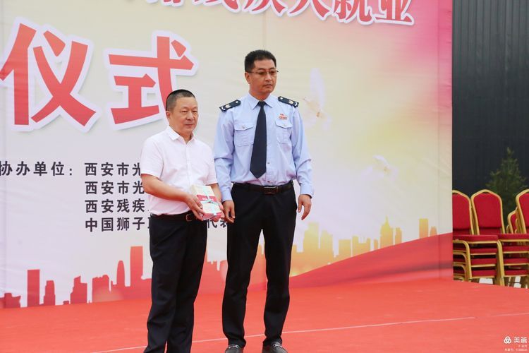 活动现场,陕西省残疾人联合会副理事长贾乃荣,西安市残疾人联合会党组书记、理事长赵寅科,西安市残疾人联合会巡视员尹绪庄,临潼区人民政府副区长霍炳男,临潼区税务局总经济师郭庆临、临潼区残联党组书记、理事长童琦,陕西省肢残协会主席王延、西安光辉实业有限责任公司董事长李辉民共同为新入职就业的10名残疾人代表颁发了入职聘书。