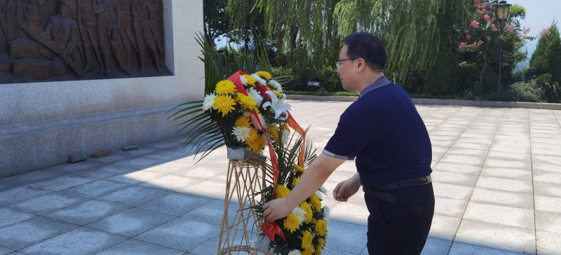 苍松翠柏,绿水环绕,在纪念馆广场烈士雕塑前,同志们庄严肃立,向革命先烈致敬。党员代表敬献花篮,全体党员鞠躬默哀。面对鲜红的党旗,在机关党总支专职副书记祁丁一的带领下大家重温入党誓词,不忘入党的初心,永葆共产党员的政治本色。党员们进入烈士陵园,缅怀革命先烈,感知那段充满血与火的峥嵘岁月。