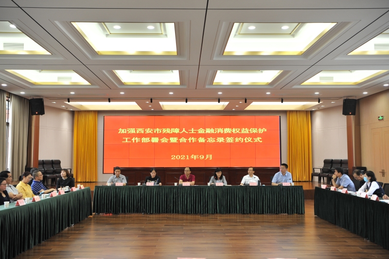 在十四运会和残特奥会陆续开幕之际, 9月2日下午,人民银行西安分行举办残障人士金融消费权益保护工作部署会暨合作备忘录签约仪式,安排部署残障人士金融消费权益保护重点工作,扎实推动全市银行网点无障碍环境建设。市残联二级巡视员尹绪庄,人民银行西安分行营业管理部、法律事务处(金融消费权益保护处)负责人出席并讲话。市残联5个专门协会负责人和建设银行陕西省分行、工商银行西安分行、光大银行西安分行、浙商银行西安分行、宁夏银行西安分行、长安银行等6家金融机构负责人参加。