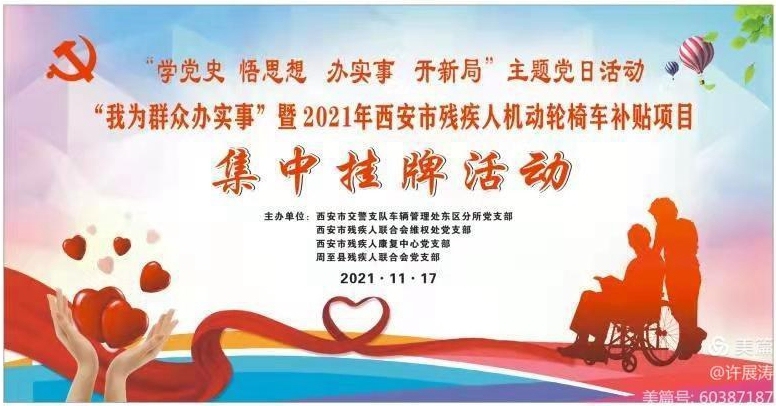 冬日暖阳,天高云淡。在举国上下深入学习贯彻党的十九届六中全会精神之际,根据“学党史 悟思想 办实事 开新局—我为残疾人办实事”主题党日活动的计划安排,为庆祝第十一届残运会暨第八届特奥会的圆满闭幕,充分展示近年来我市残疾人工作丰硕成果,展现残疾人风采,使广大残疾人朋友充分享受出行便利,按照《西安市残疾人联合会 西安市财政局关于西安市残疾人机动轮椅车补贴的实施方案》,西安市残疾人联合会维权处党支部、西安市残疾人康复中心党支部、周至县残疾人联合会党支部、西安市交警支队车辆管理处一分所党支部,于11月17日在周至县联合举行主题党日活动,为2021年度符合项目条件的残疾人机动轮椅车进行集中挂牌活动。