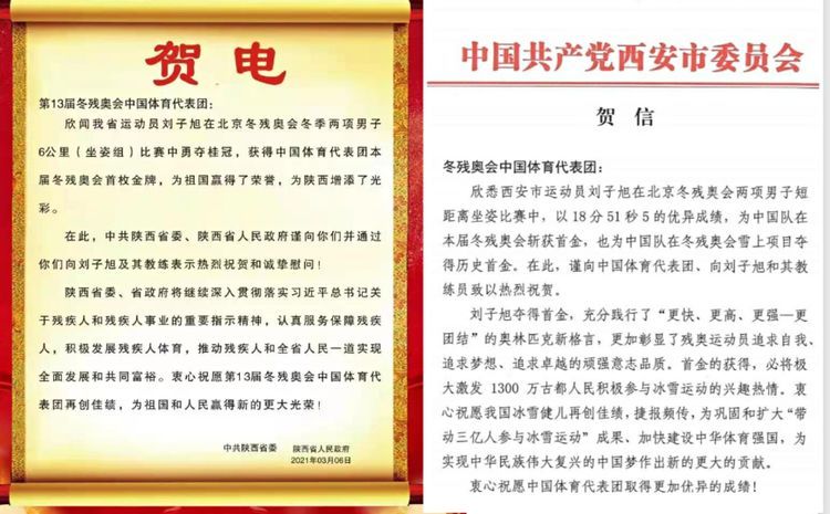 3月5日上午,西安籍运动员刘子旭在冬残奥会冬季两项男子短距离(坐姿)比赛中以18分51秒5夺得冠军,这是中国代表团在北京冬残奥会上的首枚金牌,也是中国残疾人选手获得的冬残奥会首枚雪上项目金牌和首枚个人项目金牌。中共陕西省委、陕西省人民政府,中共西安市委、西安市人民政府分别向第13届冬残奥会中国体育代表团发去贺电,向刘子旭及其教练表示热烈祝贺和诚挚慰问,并祝愿第13届冬残奥会中国体育代表团再创佳绩,为祖国和人民赢得新的更大光荣。