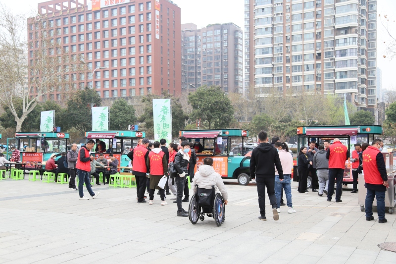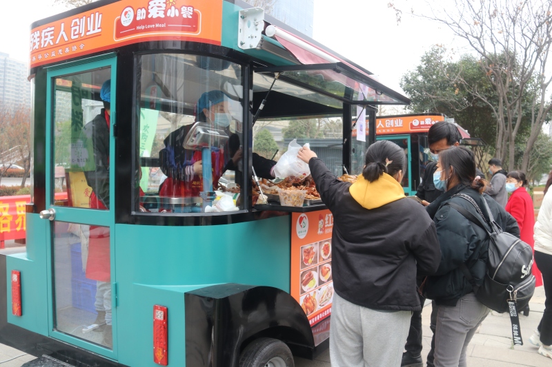在启动仪式现场,参加就业洽谈会的残疾人朋友、商户和路人驻足在爱心餐车旁,或是详细了解项目情况,或是欣赏这道独特风景,甚或是细心品味残疾人朋友的手艺。该项目对就业、创业的残疾人朋友最直接的好处就是“三方便”:一是家门口上班,地点方便;二是技术简单,学习方便;三是供应链配送,操作方便。且上班时间灵活(大部分在就餐餐口时间),没有过大的工作压力。