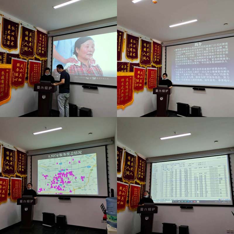 随后,雁塔区爱心护理中心负责人向钊娣带领大家参观了爱心护理中心。向主任通过宣传视频、讲解等方式向考察团展示了爱心护理中心的各项居家安养服务,中心开展的生活照料、预防检查、医疗保健、康复训练、心灵慰藉、居家护理等特色服务,高效的运行模式,以及先进的智慧化管理系统受到了考察组的一致好评。