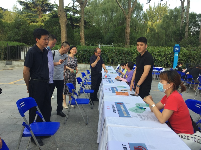 招聘会现场,碑林区残联理事长马红绪、区人社局副局长尚智、长乐坊街道办党群服务中心主任陈飞雁来到招聘展位前,详细了解企业招聘情况,并与求职者交流互动。