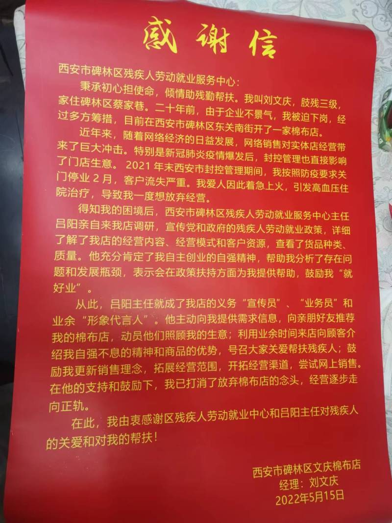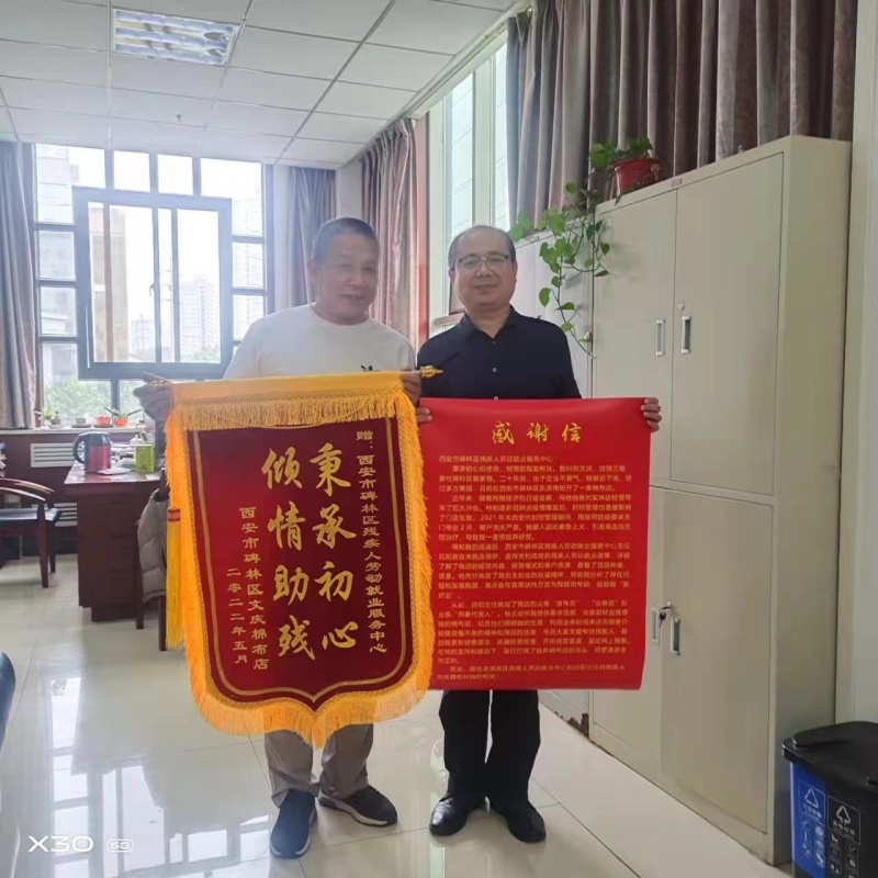 近日,我市碑林区残疾人创业者刘文庆,亲自为碑林区残疾人劳动就业服务中心及其负责人送上一面锦旗,以感谢该中心及其负责人吕阳主任对其在创业期间和疫情期间给予的关心和帮助!