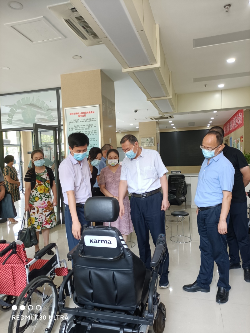 卢凯一行人参观了碑林区残疾人辅助器具服务站,听取了区残联理事长马红绪对辅助器具常态化适配服务的工作流程及工作方式的详细介绍,实地察看了残疾人辅具评估的过程,详细了解区残疾人人工智能康复机器人训练中心运营情况及取得的工作成效。随后,卢凯检查了区残联在互联网+康复服务系统进行项目审核的操作流程,询问了实际工作过程中系统存在的问题。