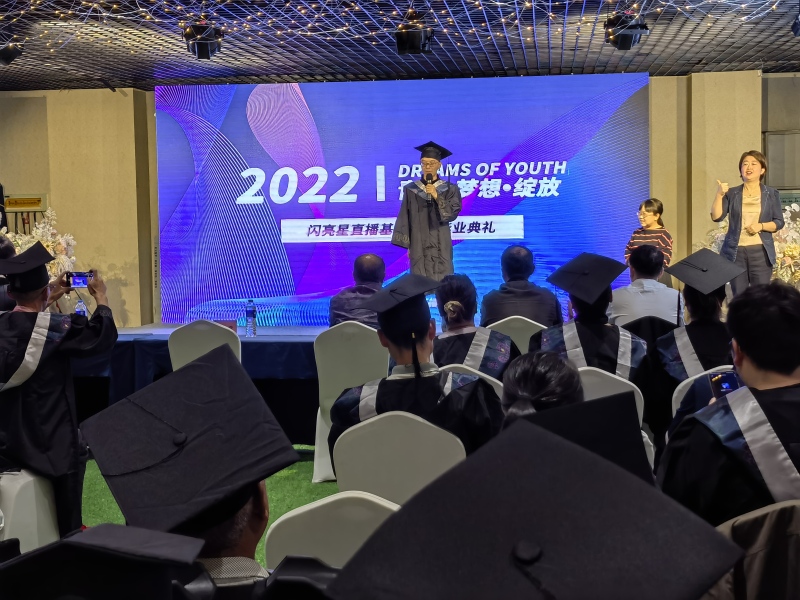 结业仪式上,播放了本期学员制作的学习感受和学习成果的短视频;闪亮星直播基地现场与陕西圆通速递有限公司、杰西允博信息科技公司签约,安置2名本期学员;学员代表吴文尧上台发言,分享学习心得。