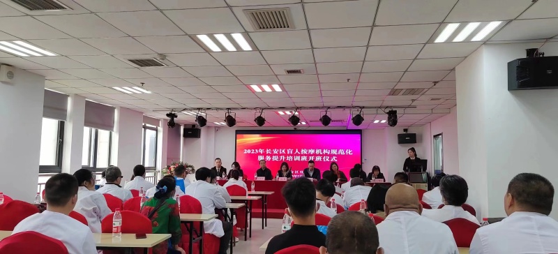 为加强长安区盲人保健按摩行业规范化建设,进一步提升盲人保健按摩行业服务水平,促进盲人按摩行业健康发展,稳定我区盲人就业,2023年5月5日,由长安区残联举办的盲人按摩店规范化管理服务提升培训班在长安区易通技能职业培训学校开班,参加开班仪式的有市残疾人劳动就业中心副主任寇红霞,长安区残联党组书记、理事长韩利波、三级调研员胡发军、市残疾人就业中心就业科科长祁秀丽,以及长安区财政局、残联相关科室人员,全长安区38家盲人按摩店负责人。