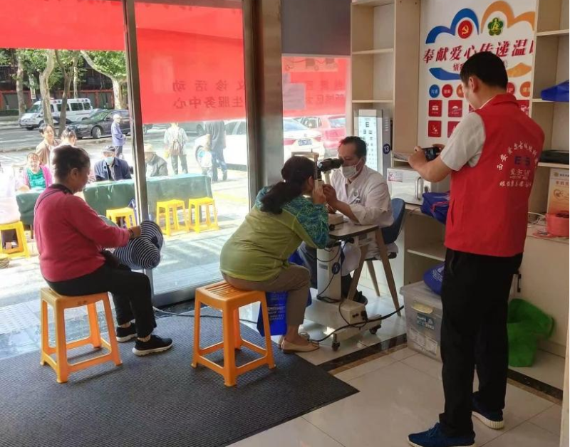 社区卫生服务中心工作人员为过往群众测量血压并询问健康状况,根据病史提出复查建议。爱尔古城眼科医院的医生为群众测视力、检查眼睛,针对一些常见的眼部疾病提出初步治疗建议。残联工作人员向群众发放视力残疾预防知识宣传彩页,呼吁群众多多关注自己以及家人的眼部健康问题,发现异常及早就医,减轻疾病带来的影响。